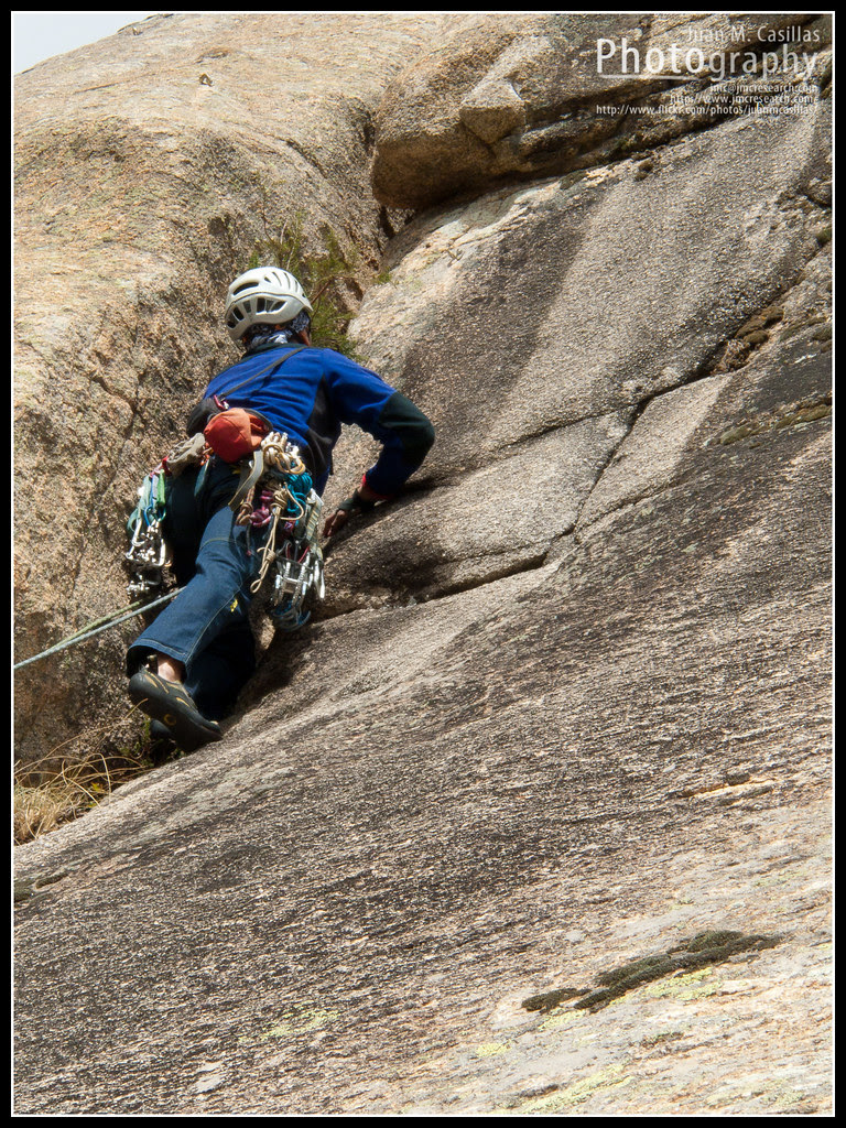 El segundo largo se supone que me lo doy yo, así que me pongo los cacharros y salgo. La vía sigue por una fisura ancha y con agarre, para luego meterse en una placa, darse un paso sobre una especie de techo, y luego travesía a la derecha hasta la reunión. Y digo se supone porque me tuve que bajar. Para empezar, mi nula técnica de fisuras hace que sude un poco para subir (por fuera) y asegurar la fisura. Con mas miedo que vergüenza me la doy y me meto en la placa, no sin antes meter los dos aliens en la fisura del borde. Para nada, porque la placa será de IV y se hace bien hasta la primera chapa. Desde ahí, otra tirada larga te deja debajo del techo para chapar, pero me puede el coco y me bajo de la chapa. En el fondo hice bien, porque lo que quedaba era un paso largo para chapar, otro paso mas largo aún para proteger, y otra travesía loca. Yago que es un titán toma el relevo y se aprieta el largo sin problemas. Nos recupera hasta la reu sin mas novedad.