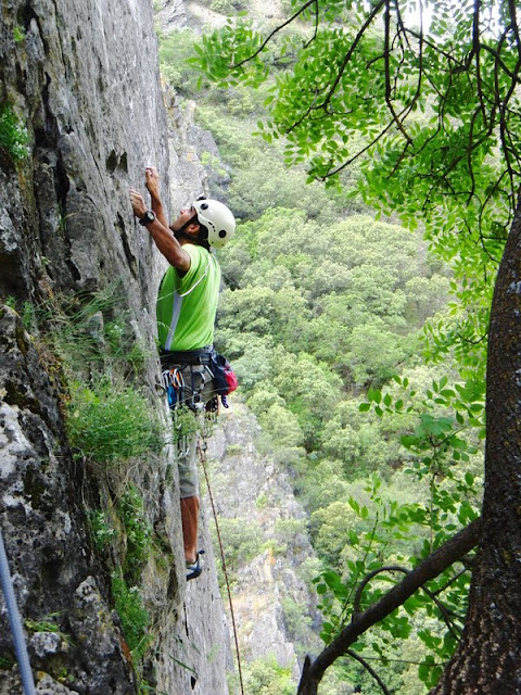 El domingo pasado nos acercamos al arroyo de los huertos a "explorar" la zona, por si las vías de la placa del gran bloque estaban equipadas, o no, o qué. Esta zona presenta unas cuantas vías fáciles, que aunque están muy cerca de la zona del cancho de los brezos, están bastante tranquilas, son de varios largos, y recorren unas lineas interesantes. El problema de esta zona es que desde que se equiparon las vías, han sufrido el azote de los saqueadores. Vamos, que las han "limpiado", vuelto a equipar (del bosillo de la gente) vuelto a robar ... y parece que a fecha del domingo, algo se podía hacer. Pero sigue leyendo, porque tiene algo de truco.