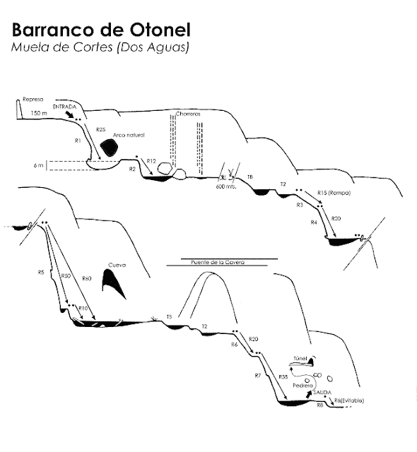 El barranco comienza con un rápel muy bonito por un arco natural, una pena que no caiga el agua por aquí... pero eso se arregla pronto, porque tras pasar la poza seca, se nos pone a llover como si no hubiese un mañana. Esto no hace que se llene el barranco, pero ya nos hace apretar un poco "la cacha". Ya sabéis, la aprensión esa de las crecidas ...