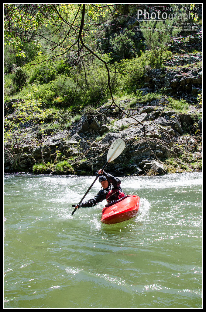 Así que nada, me monto, tiro para el paso ... y cuando me quiero dar cuenta ya estamos en el lío. Un apoyo para evitar volcar ... y ya está, a disfrutar viendo como baja la gente, cada uno con su estilo pero todos pasándoselo bien. Hasta la barca de raft pasó por allí. Muy divertido. Después volvemos a embarcar, y como no me iba a ir sin volcar hoy, me meto en un remolino que me voltea, y al estar pegado contra la pared, no puedo esquimotar y me toca nadar. por novato me doy la nadadita del día. Así que vacío y le damos a lo que queda del río (unos 500m)