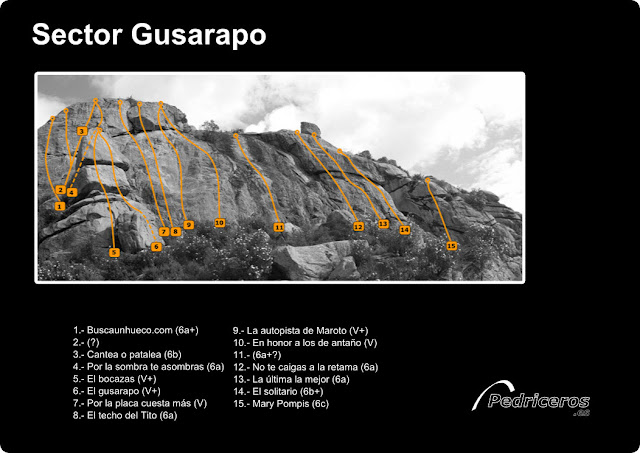 El domingo se levantó el día raror, raror, raror. En un primer momento parecía que iba a llover, pero luego no... en fin, incertidumbre. Los partes meteorológicos no eran muy halagüeños, pero el mapa de radar decía que no llovía, y el de isobaras decía que aumentaba la presión... así que nos arriesgamos y decidimos subir al sector "El gusarapo", en nuestra querida Pedriza. Este sector está cerquita del coche, y además no es "pura adherencia" sino que tiene regletitas y cantitos, así que ideal para pasar una mañana escalando sin sufrir mucho. Lo malo de este sector es que suele ponerse de gente hasta las patas, y claro, en fin de semana suele estar imposible. Aunque la lluvia hace milagros, y nosotros llegamos a eso de las 9:30 y no había ni el tato. Así que nos pusimos a mirar las vías y a preparar las cosas.